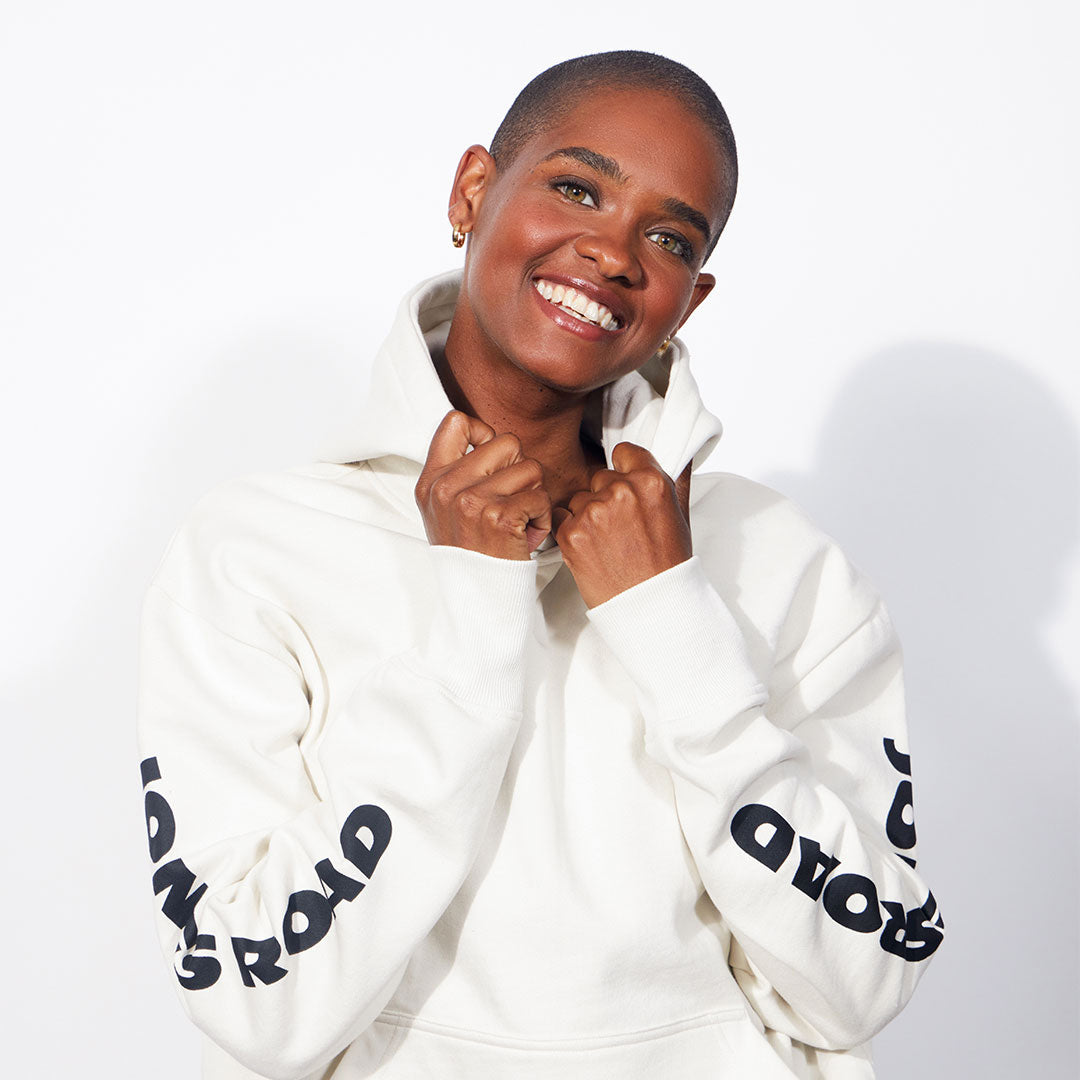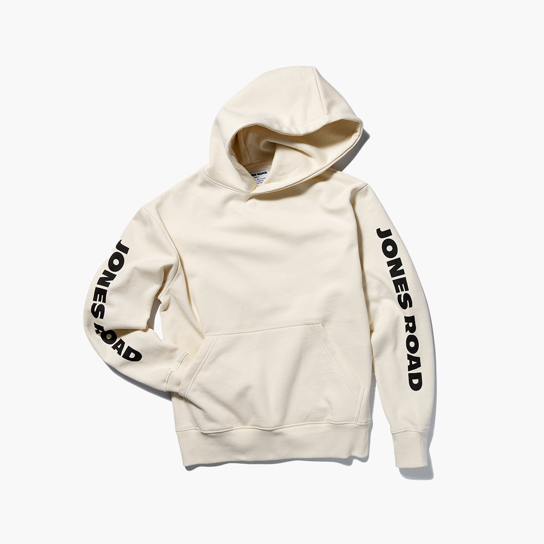 Our first hoodie - and a Jones Road office favorite. Oversized with a plush and cozy interior. Available in Black/Pink and Bone/Black options. Made of 90% Cotton, 10% Polyester.